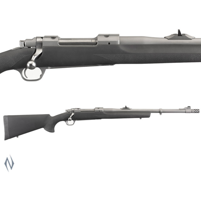 RUGER HAWKEYE ALASKAN >>Specifications <>Stock: Black Hogue Over-Moulded <>Front Sight: Bead <>Rear Sight: Adjustable Express Style <>Magazine Capacity: 3 rounds <>Barrel Length: 20" <>Overall Length: 42" <>Material: Stainless Steel <>Finish: Hawkeye Matte <>Length Of Pull: 13.50" <>Twist: 1:10" RH <>Weight: 8lb <>Grooves: 5 >>Features <>Non-rotating, Mauser-type controlled round feed extractor is among the most positive case extraction systems ever invented. <>Hinged, solid-steel floorplate for easy unloading without having to chamber each cartridge. <>Three-position safety allows loading and unloading of the rifle with the safety engaged. <>Hogue Over-Moulded stock is moulded from durable synthetic rubber. <>Cold hammer-forged barrel provides exceptional accuracy and longevity. <>Shallow "express-style" windage-adjustable V-notch rear sight and white bead front sight. <>Integral scope mounts, machined directly on the solid-steel receiver. <>The LC6 trigger features smooth, crisp performance right out of the box. <>Rugged, one-piece, stainless steel bolt. <>The Ruger Muzzle Brake System includes a removable, radial-port muzzle brake that significantly reduces felt recoil. >>Also includes: barrel band mounted swivel stud; optional forend swivel stud. >>THE RUGER MUZZLE BRAKE SYSTEM: >>Includes a removable, radial-port muzzle brake that significantly reduces felt recoil. For times when the brake is not preferred, it may be replaced by the included dynamically-matched muzzle weight. Switching between the brake and the weight will not change the bullet's point of impact for a particular load. The included thread protector may be used if neither the brake nor the weight is desired.