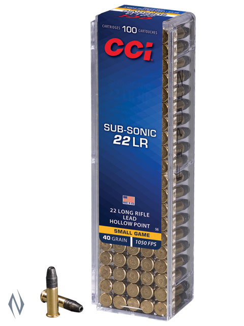 >>Clocking in at sub-sonic velocities, this load creates less noise, yet its bullet expands reliably for quick kills on a variety of small game. Sub-Sonic HP is loaded with consistent CCI® primers and brass. >>FEATURES <>Low noise <>1,050 fps muzzle velocity <>Bullet expands without fragmenting <>Great performance on small game >>SPECS <>Calibre: 22 LR <>Grain Weight: 40 <>Bullet Style: Lead Hollow Point <>Muzzle Velocity: 1050 <>Ballistic Coefficient: .120 <>Package Quantity: 100 <>Usage: Small Game