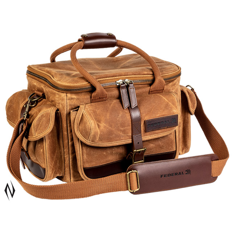 >>Shoot in style with the NEW Federal Premium bags and gear. The lineup includes shotgun and rifle cases as well as shell and range bags. All are built with the finest materials, including 18-ounce waxed canvas, top-quality zippers, leather accents, brass hardware and embossed leather logo patches.