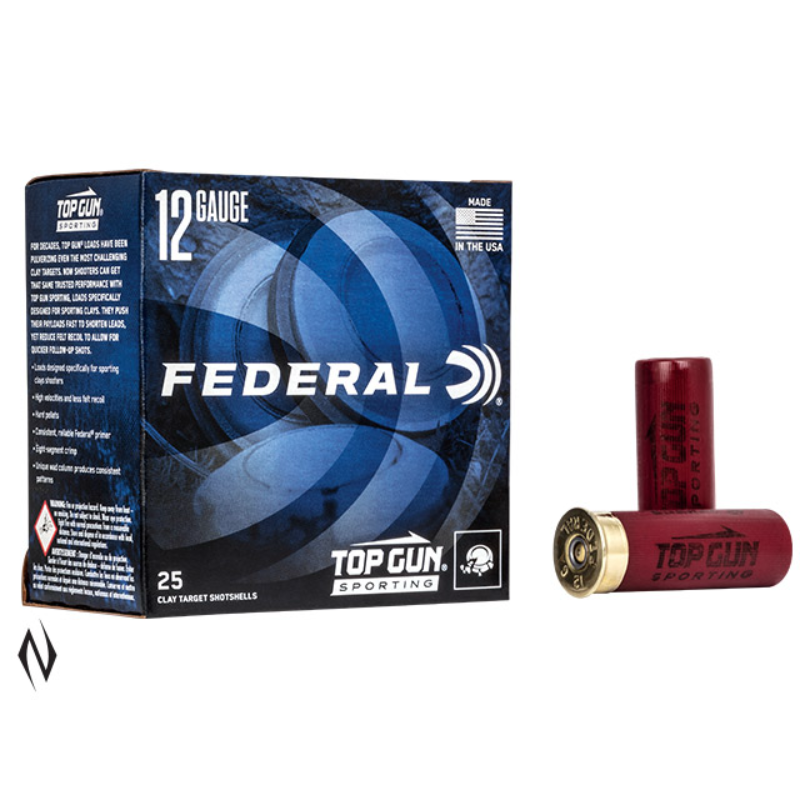 >>For decades, Top Gun loads have been pulverizing even the most challenging clay targets. Now shooters can get that same consistent, trusted performance with Federal Top Gun Sporting, loads specifically designed for sporting clays. They push their payloads fast to shorten leads, yet reduce felt recoil to allow for quicker follow-up shots. <>Loads designed specifically for sporting clays shooters <>High velocities and less felt recoil <>Hard pellets <>Reliable primer <>Consistent patterns <>Designed specifically for sporting clays shooters <>Three velocities available: 1250fps, 1300fps & 1330fps