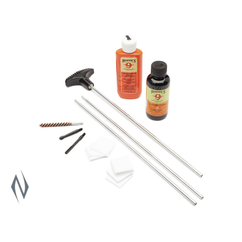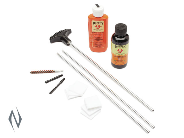 .17-.204 CALIBRE CLEANING KIT WITH STEEL ROD >>Kit includes: <>Brush to fit your specific calibre. <>Hoppe’s legendary No. 9 Gun Bore Cleaner <>Hoppe’s No. 9 Lubricating Oi l