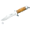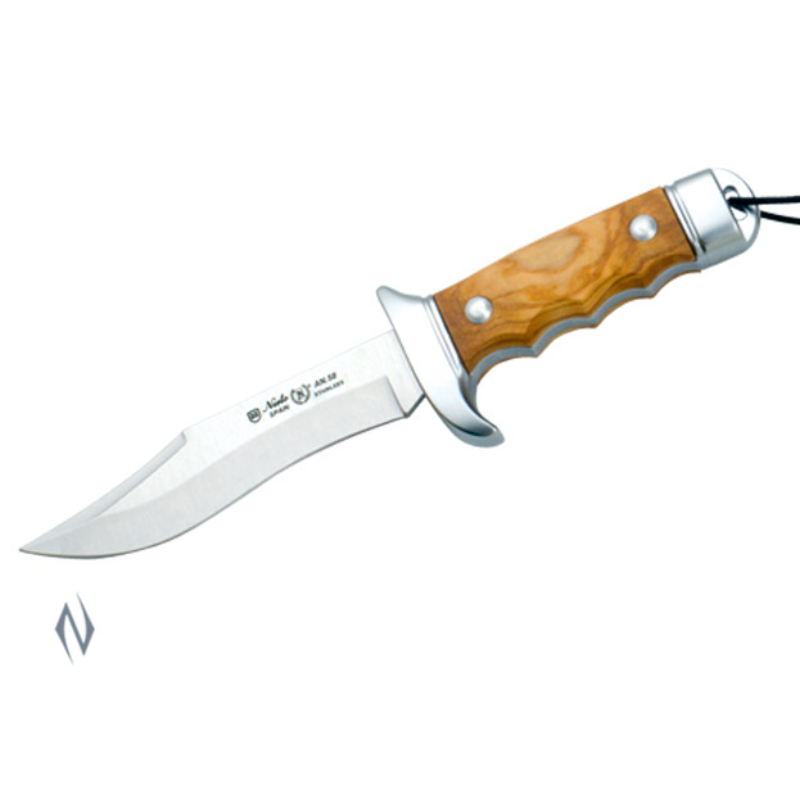 <>Total size: 20cm <>Blade size: 11cm <>Blade: AN-58 Steel <>Handle: Hard chrome and natural olive wood <>Sheath: Brown finest quality leather <>Weight: 165g