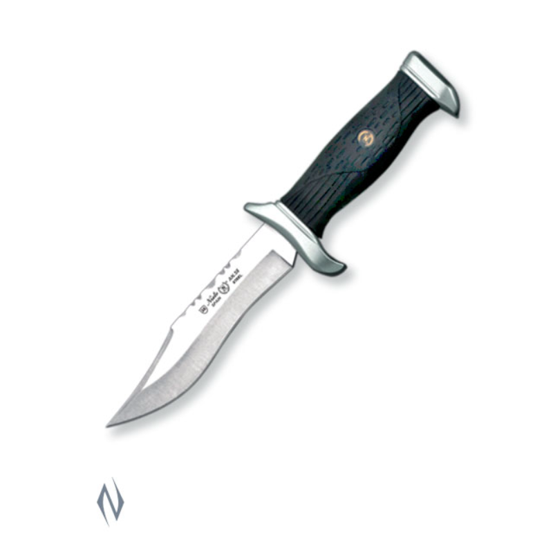 <>Total size: 21cm <>Blade size: 11cm <>Blade: AN-58 Steel <>Handle: Hard chrome and forprene <>Sheath: Black finest quality leather <>Weight: 159g