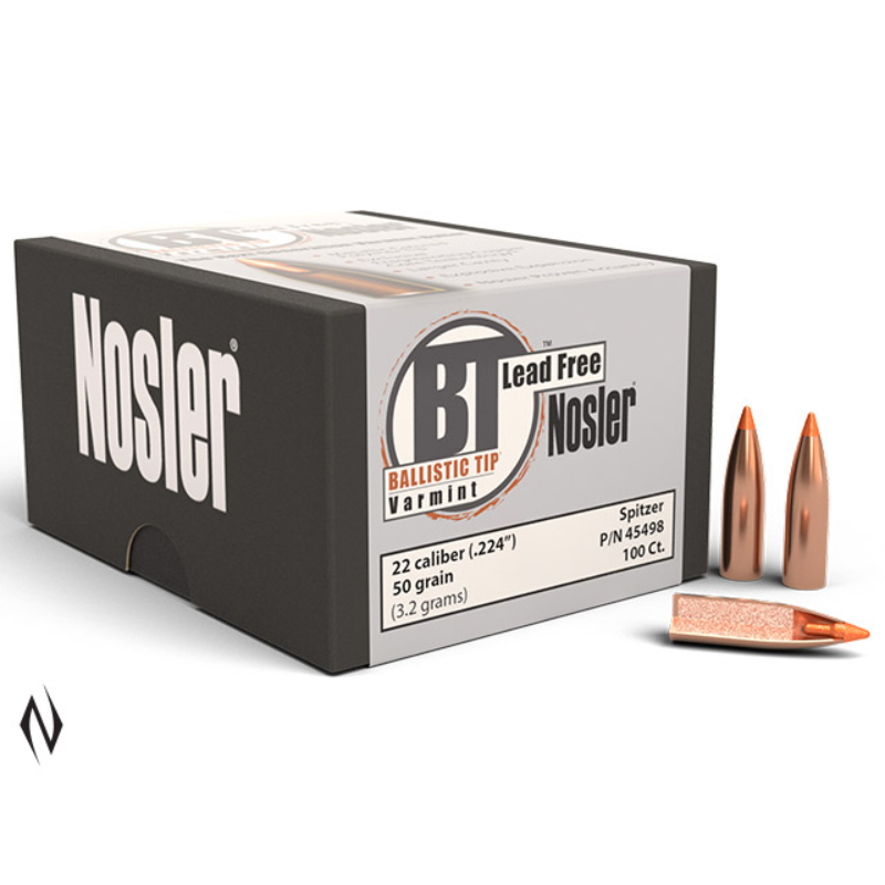 >>The Ballistic Tip Lead-Free (BTLF) is everything that varmint and predator hunters expect from a Ballistic Tip, in a lead-free design. The flat-based, leadless bullet features Nosler's exclusive Fragmenting Copper Core Technology (patent pending) which exhibits immediate and rapid expansion, initiated by its metallic-colored polymer tip, at practical varmint shooting velocities of 1600 fps and above. >>The BTLF can safely be used in all lead-free zones or shooting ranges that require non- magnetic bullets. Users can be confident of the same performance and quality that the Ballistic Tip has made famous for more than 25 years. >>Ballistic Tip Lead-Free bullets are offered at the same MSRP as standard Ballistic Tip bullets in 50ct. and 100ct. boxes. >> <>Unique Metallic- Colored Polymer Tip: Nestled in the jacket mouth is the streamlined polymer tip, color-coded by caliber. <>Ultra-Thin Copper Jacket: Retains structural integrity at ultra-high velocities yet fragments completely upon impact <>Fragmenting Copper Core: Allows rapid and absolute displacement of target <>Flat Base: Ballistically engineered for ultra-high velocities and bench rest accuracy