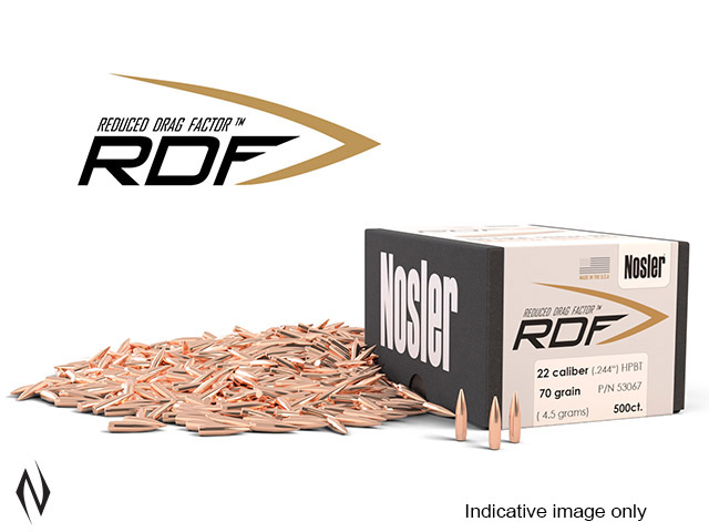 >>FLATTEST SHOOTING MATCH BULLET ON THE MARKET >>Nosler knows what gives competitive shooters an edge, isn't an edge at all. It's a point. And we've worked hard to bring you the smallest one ever - creating the flattest shooting match bullet on the market. Make the switch to RDF, and put yourself on the podium. >>Nosler's RDF line was designed from the ground up to provide exceptionally high BCs, which create the flattest trajectory and least wind drift possible. The keys to the RDF's outstanding performance are Nosler's meticulously optimised compound ogive and long, drag reducing boattail, which make handloading a snap and create an incredibly sleek form factor. RDF bullets also have the smallest, most consistent meplats of any hollow point match bullet line, so there is no need to point or trim tips. >>Highest BC's, smallest meplat, tighter groups - Nosler RDF