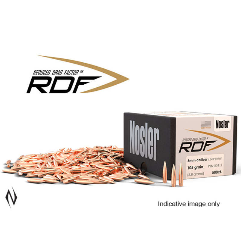 >>FLATTEST SHOOTING MATCH BULLET ON THE MARKET >>Nosler knows what gives competitive shooters an edge, isn't an edge at all. It's a point. And we've worked hard to bring you the smallest one ever - creating the flattest shooting match bullet on the market. Make the switch to RDF, and put yourself on the podium. >>Nosler's RDF line was designed from the ground up to provide exceptionally high BCs, which create the flattest trajectory and least wind drift possible. The keys to the RDF's outstanding performance are Nosler's meticulously optimised compound ogive and long, drag reducing boattail, which make handloading a snap and create an incredibly sleek form factor. RDF bullets also have the smallest, most consistent meplats of any hollow point match bullet line, so there is no need to point or trim tips. >>Highest BC's, smallest meplat, tighter groups - Nosler RDF