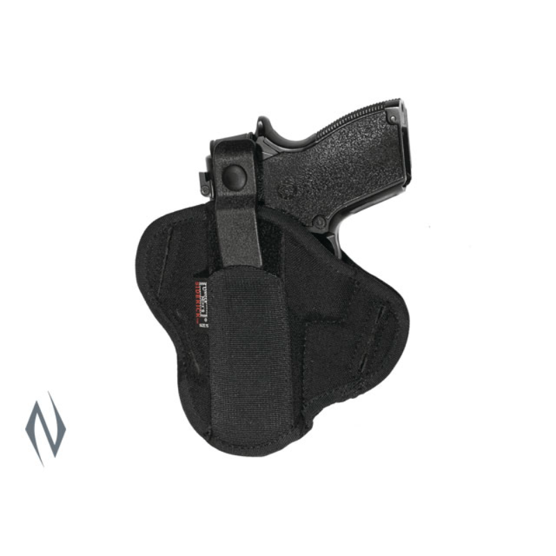 HIDDEN HAMMER SUPER BELT SLIDE HOLSTER (PANCAKE) >>Efficiently retains concealed, shrouded or spurless hammered guns. <>Holds 2", five-shot revolvers, using an internal retention mechanism. <>Internal locking device fits into revolver trigger guard. A separate, sewn-down retention strap fits positively over gun frame.