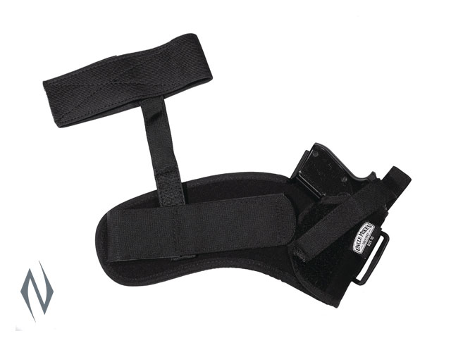 ANKLE HOLSTERS <>Hides small and medium hand guns, even compact large-frame autos inside pant leg <>Kodra nylon with soft-knit fabric for durable comfort <>Cinch-down design with Hook & Loop adjustment <>Nylon web retention strap with reinforced thumb break <>Right-hand model for inside left leg <>Left-hand model for inside right leg <>Wrap-around design sungs holster strap around ankle <>Hook and loop adjustable, removable calf strap