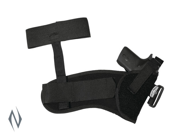 ANKLE HOLSTERS <>Hides small and medium hand guns, even compact large-frame autos inside pant leg <>Kodra nylon with soft-knit fabric for durable comfort <>Cinch-down design with Hook & Loop adjustment <>Nylon web retention strap with reinforced thumb break <>Right-hand model for inside left leg <>Left-hand model for inside right leg <>Wrap-around design sungs holster strap around ankle <>Hook and loop adjustable, removable calf strap