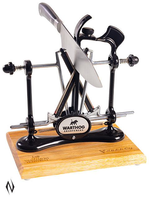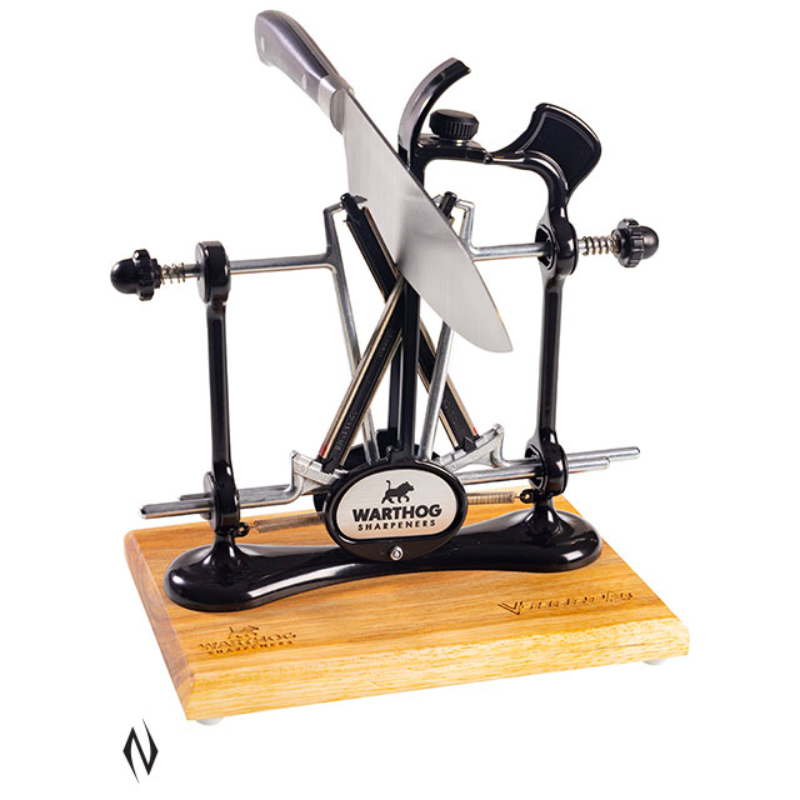 >>Everyone has experienced the problems caused by using dull knives. The all-new ELITE A4 is your solution. It is the bestselling A4 model with the addition of a deluxe wooden base to make sharpening even easier! It uses two high quality, 325 grit diamond hones that sharpen both sides of the blade simultaneously. >>The A4 uses the patented V-Sharp system with angle settings of 15, 20, 25 and 30 degrees to sharpen virtually any knife. It is the perfect diamond knife sharpener for home use, chefs, fishermen, and hunters. Use with our ceramic hones to sharpen serrated blades with ease! >>The A4 knife sharpener is easy to use, fast, and accurate. Using Warthog Sharpeners, almost anyone can sharpen a dull knife. >>Features: <>Breakthrough 15 degree angle for high end specialty knives. <>Patented V-Sharp system for precision angle adjustments. <>Comes with a Deluxe Wooden Base. <>4 Adjustable Angles 15, 20, 25 & 30 deg. <>325 Grit Natural Diamond Hones with finishing steels included. <>Metal Frame Construction. <>Durable Powder coat Finish. <>Choice of 4 colours (Black, Gunmetal Grey, Red & Aqua Sky) >>Additional 270, 325, 600, 1000 grit and ceramic hones available.